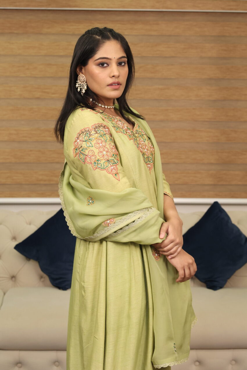 Soft, serene, and steeped in delicate charm—Aafreen brings together traditional embroidery and modern ease. This pistachio-hued ensemble is perfect for heartfelt celebrations and intimate rituals.
