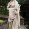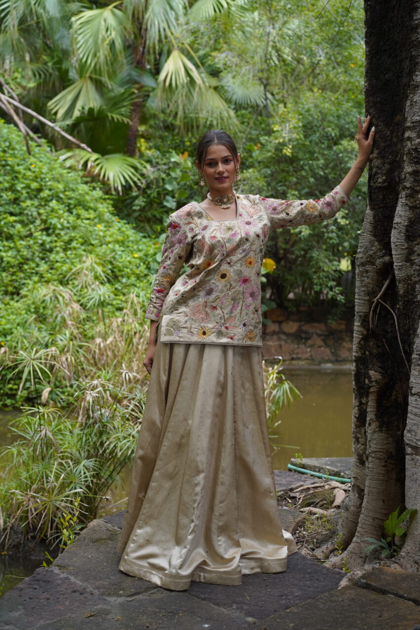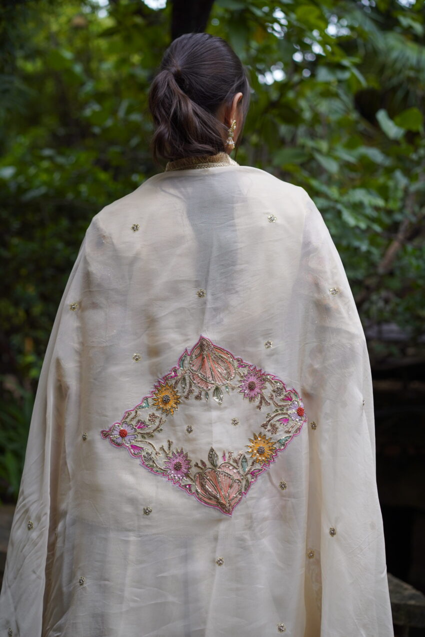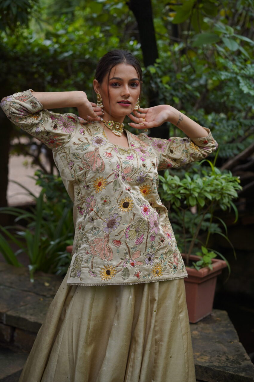 Abeer is a vision in ivory—featuring a delicately hand-embroidered peplum top blossoming with multicolour floral resham detailing. Paired with a flared chanya that carries a soft sheen and a dupatta sprinkled with dainty accents and zardozi borderwork, this ensemble feels both light and luxe.