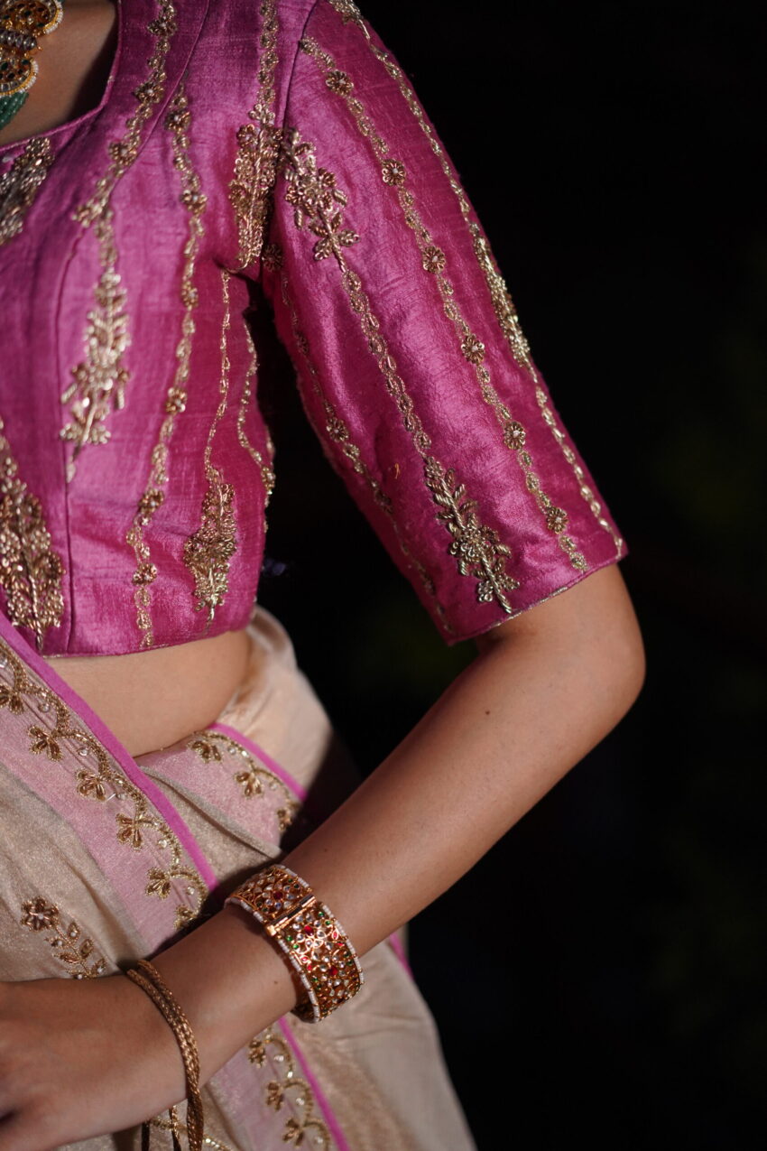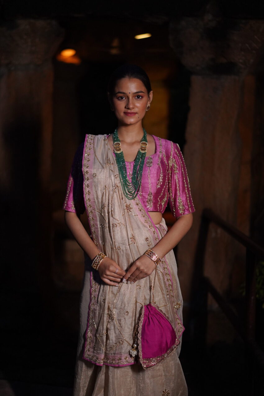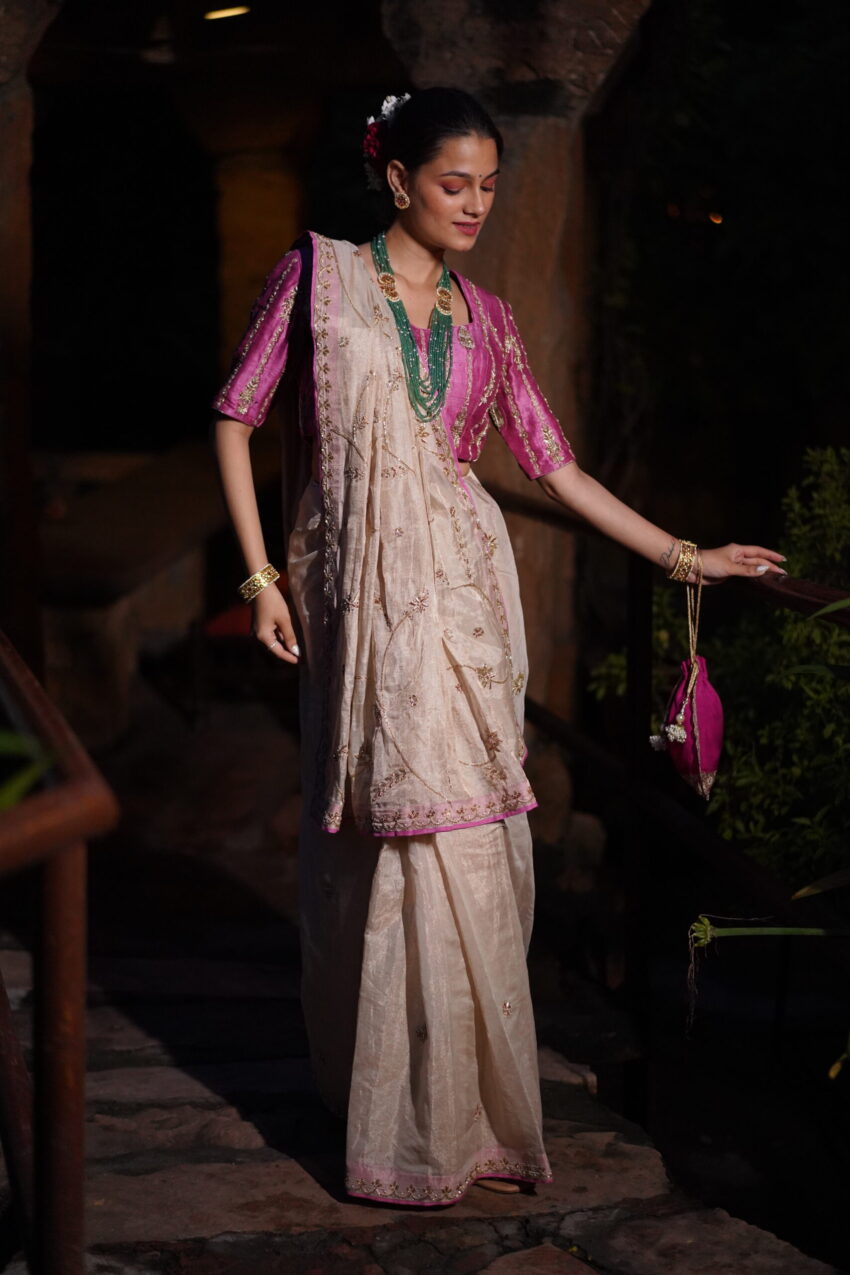 A celebration of grace woven in heirloom textures—Amaira features a stunning Banarasi tissue saree paired with a richly detailed raw,silk brocade blouse. Accented with hand-embroidered zari work and traditional finishing, this set brings old-world charm to contemporary poise.