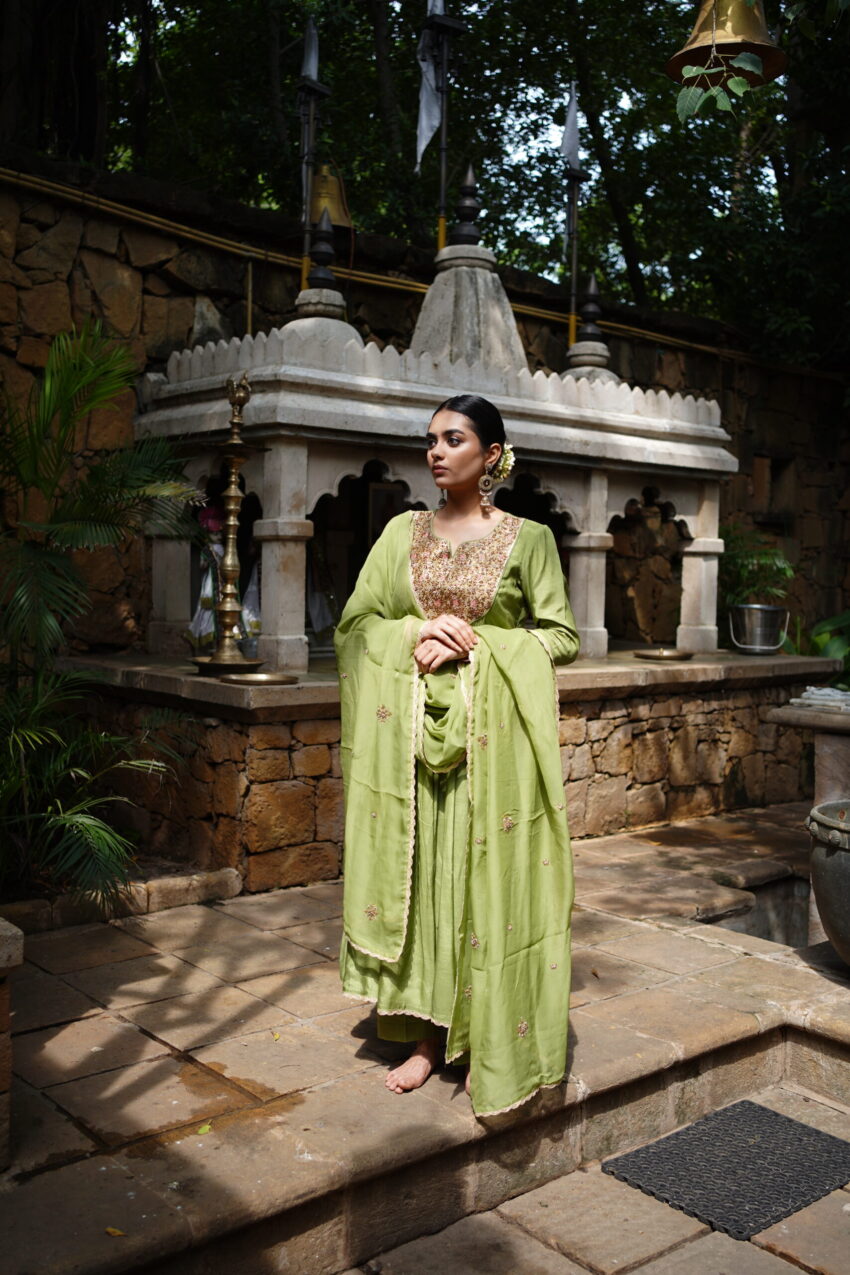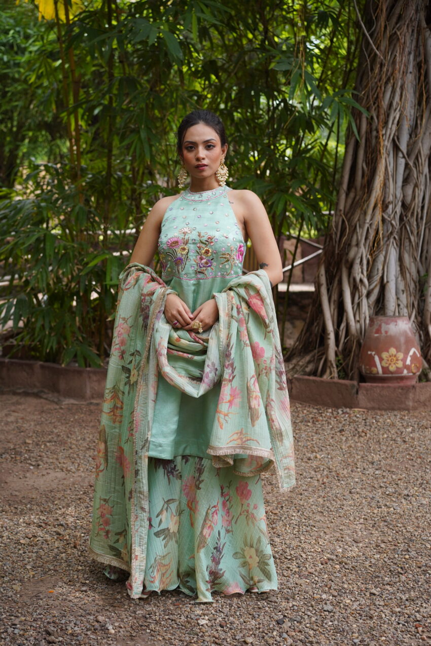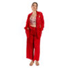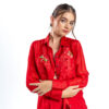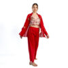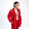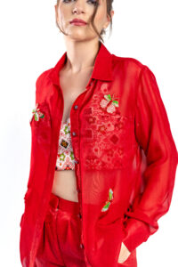 A bold blend of elegance and edge, the Crimson Bloom Cord Set features a sheer organza shirt detailed with delicate butterfly embellishments, paired with relaxed yet tailored red trousers. Styled with a hand-embroidered printed bustier, this look is a perfect expression of modern femininity with a festive twist. Crafted for comfort and confidence, it’s your go-to set for making a statement.