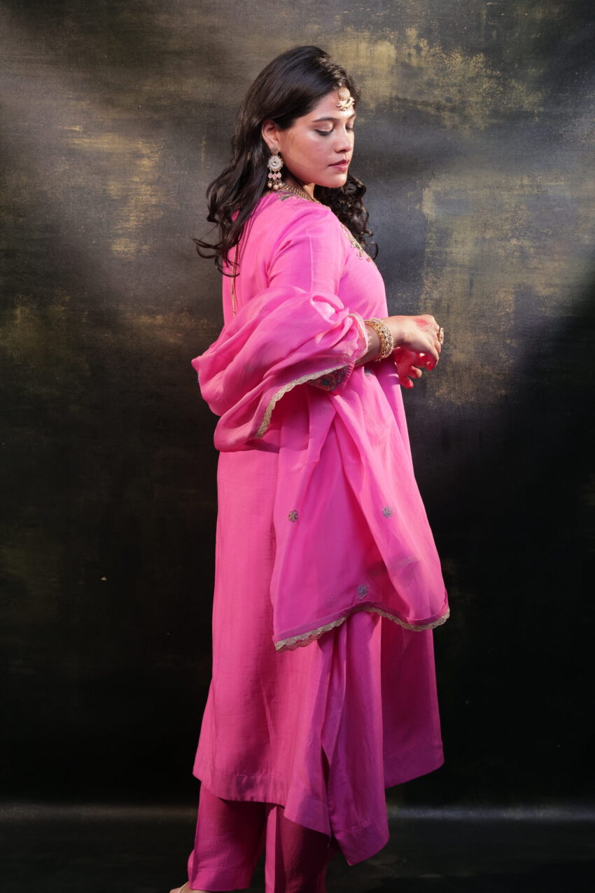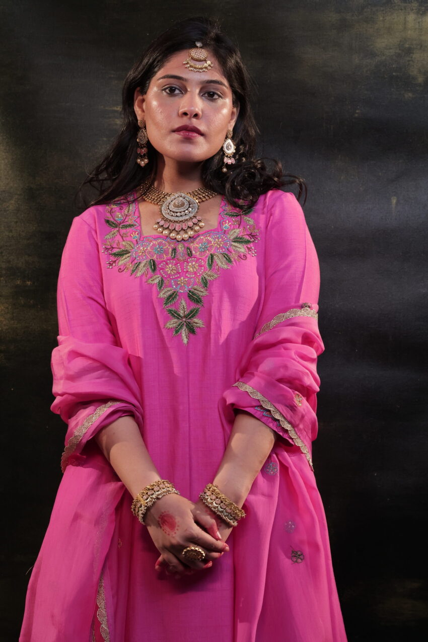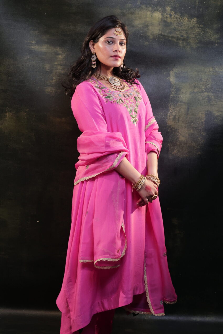 Soft and striking, Gulveen celebrates feminine grace in a vibrant rose-pink hue. Accented with intricate threadwork and scalloped lace, it’s crafted for those who love to stand out—subtly, beautifully.