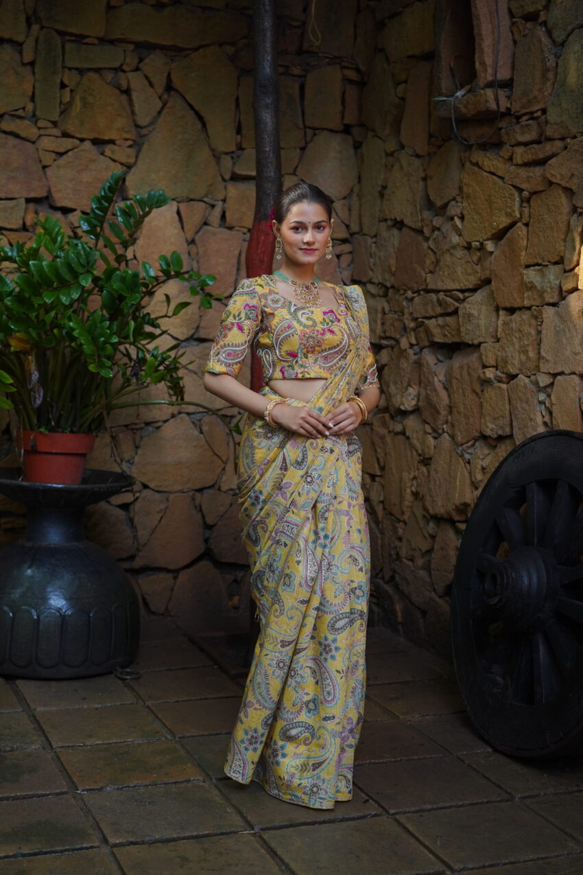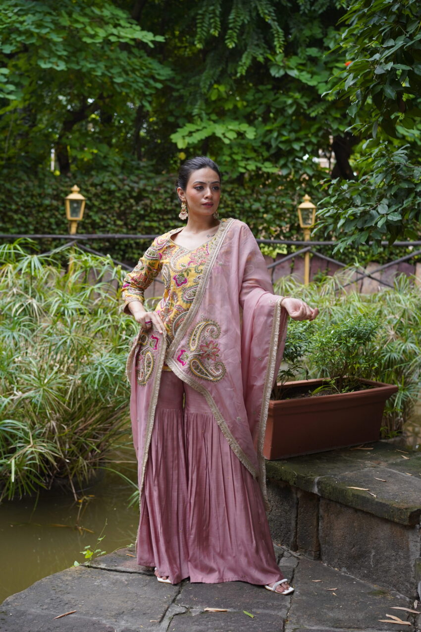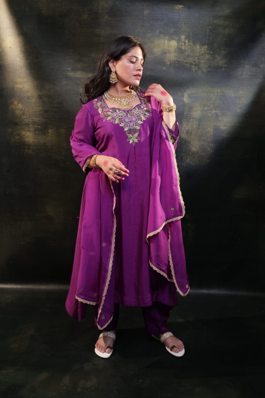 Soft and striking, Gulveen celebrates feminine grace in a vibrant rose-pink hue. Accented with intricate threadwork and scalloped lace, it’s crafted for those who love to stand out—subtly, beautifully.