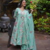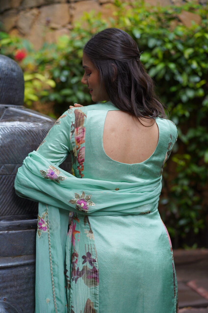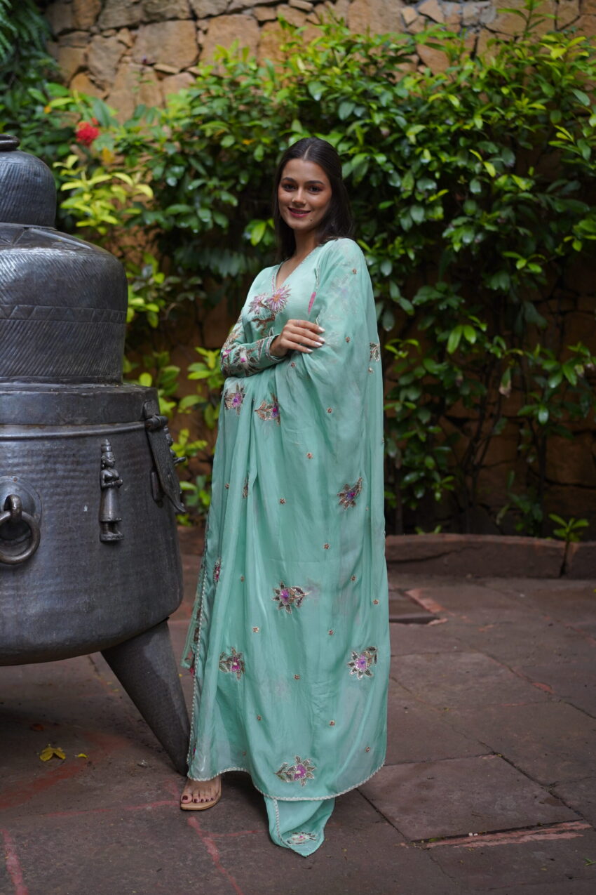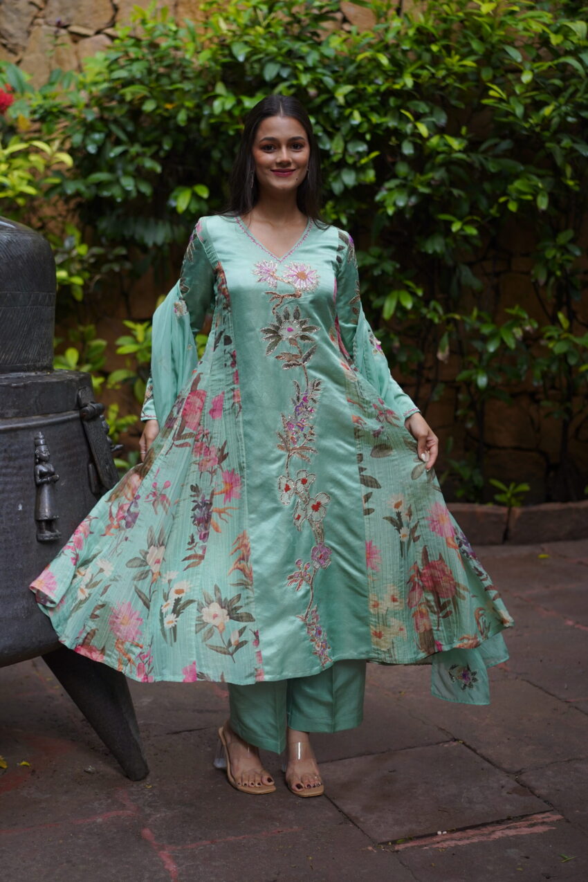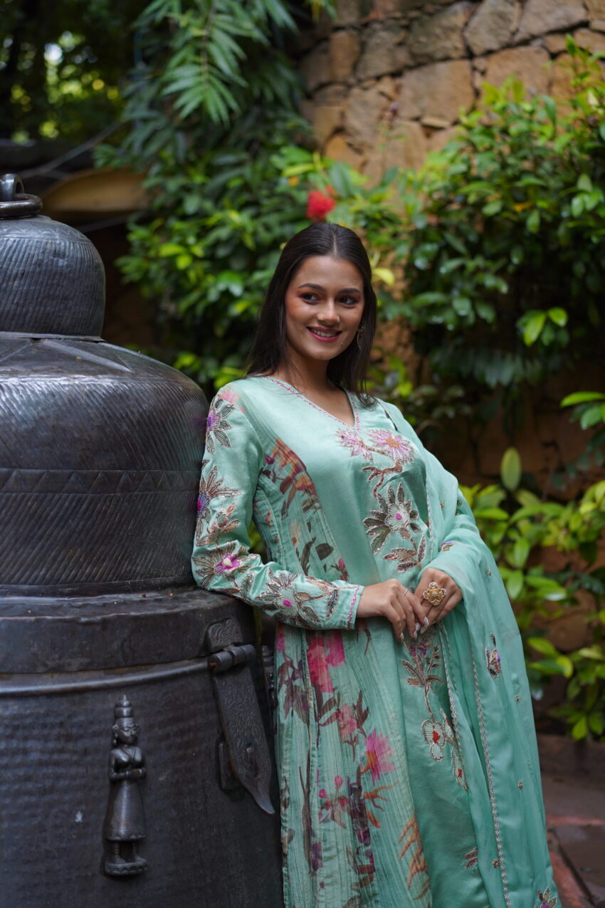 Iravya—where nature meets celebration. Draped in a delicate mint green hue, this handcrafted Anarkali is adorned with fine floral resham and embroidery on soft silk. The side panels carry printed blooms, adding a playful twist to the elegance. Paired with a sheer organza dupatta featuring statement embroidered motifs.
