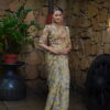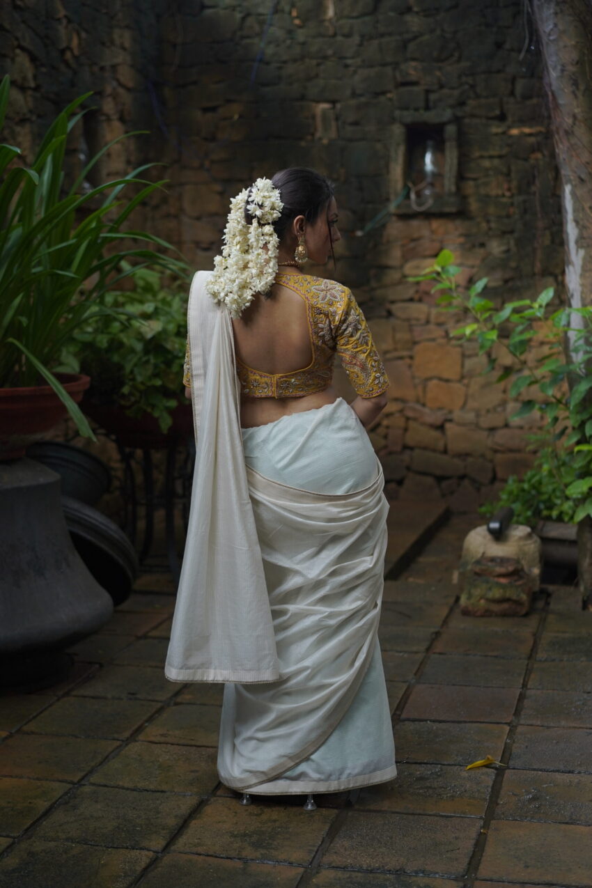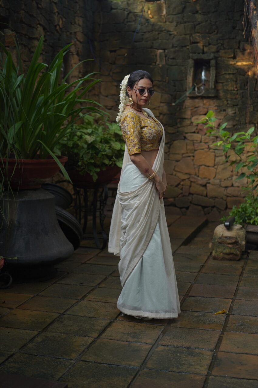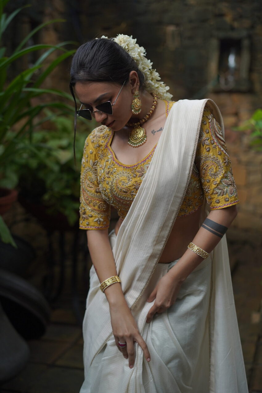 A celebration of craftsmanship and culture, Kaashni features a mustard yellow blouse intricately hand-embroidered with paisley and floral motifs—shimmering with zardozi, sequins, and antique beadwork. Paired with a soft ivory handwoven saree, this ensemble bridges tradition and grace, making it an elegant choice for festive rituals and heritage celebrations.