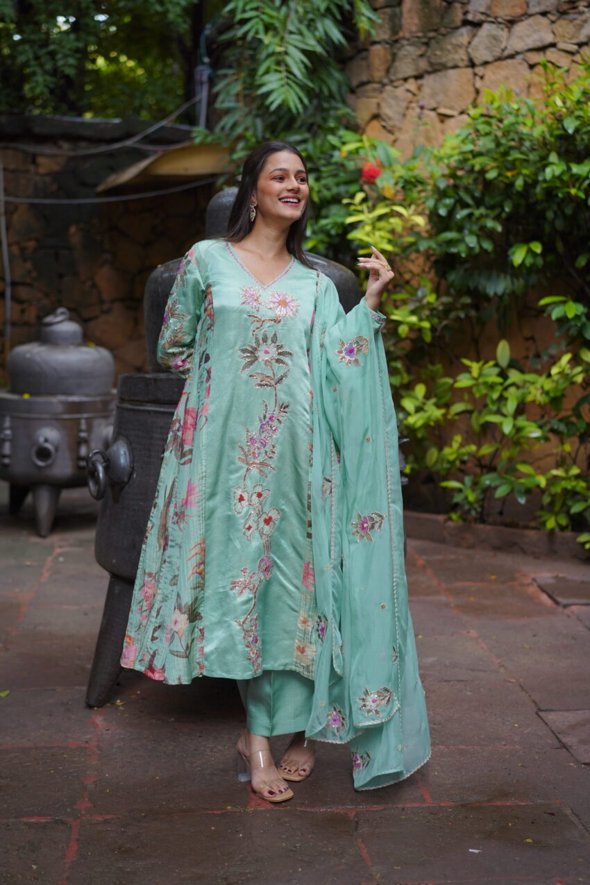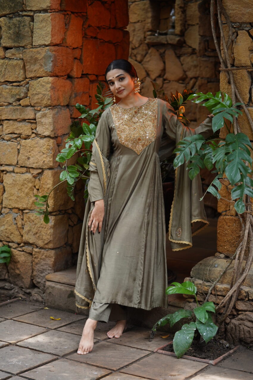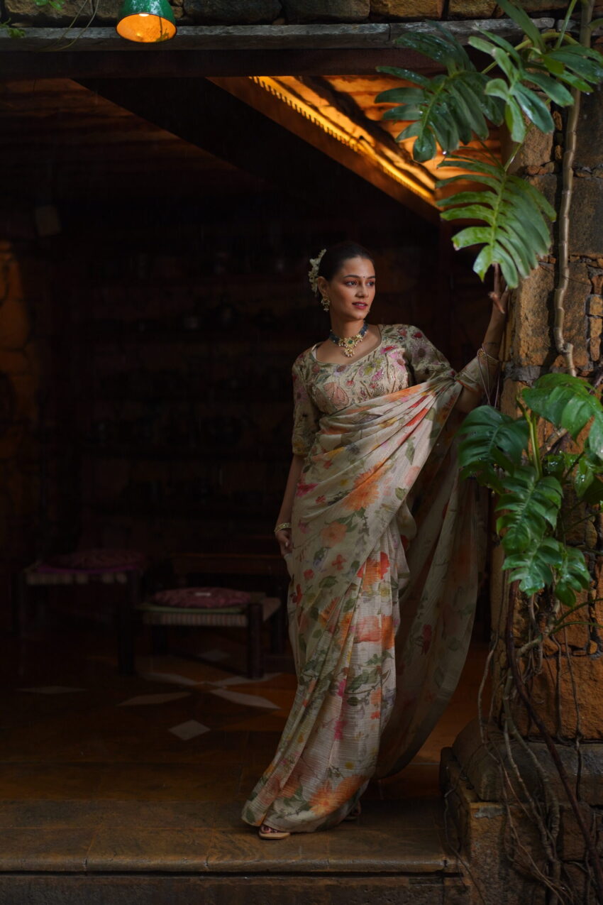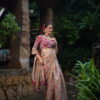 A celebration of craftsmanship and culture, Kaashni features a mustard yellow blouse intricately hand-embroidered with paisley and floral motifs—shimmering with zardozi, sequins, and antique beadwork. Paired with a soft ivory handwoven saree, this ensemble bridges tradition and grace, making it an elegant choice for festive rituals and heritage celebrations.
