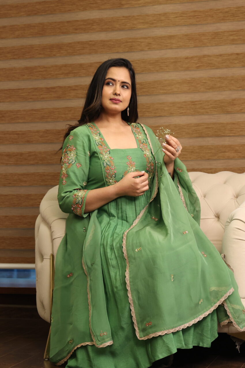 Draped in nature’s calm—Nehal is a fresh ode to celebration. With earthy sage tones, delicate florals, and a gracefully gathered silhouette, it’s perfect for your pooja rituals and family festivities.